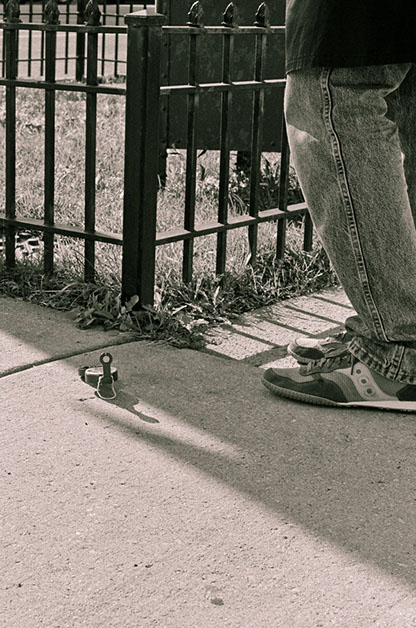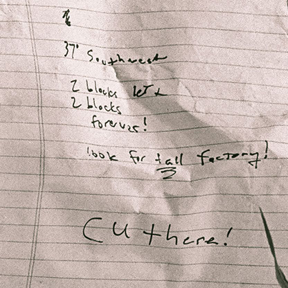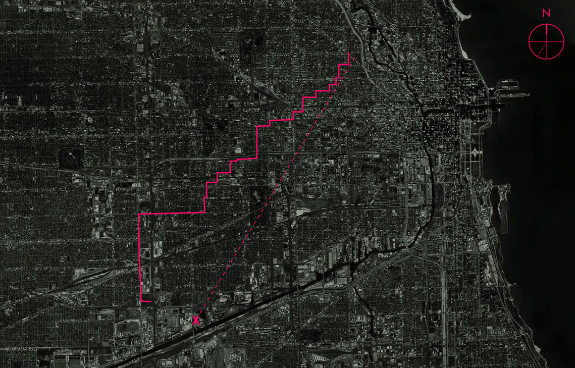 A five-hour walk from Polonia Triangle in Chicago, Illinois, to a piece of waste land bordering the suburb of Cicero's eponymous avenue, in an attempt to reach the farthermost identifiable object on the horizon, as seen from the windows of Noble Square Coop's apartment 1810 (1165 North Milwaukee Avenue). A compass reading for the chimney-like object would then be used as a guideline to navigate through the city grid, a new reading being taken at each intersection or so. Keeping course at 37° SW as best as possible led to a partial success; a fenced industrial complex preventing further advance marked the end of the undertaking, a short distance away from target, by then visible.